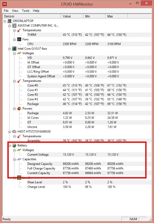 HWMonitor hiển thị thông tin dung lượng pin gốc và hiện tại, giúp bạn biết được pin chai bao nhiêu phần trăm, rất hữu ích khi mua bán hoặc kiểm tra laptop cũ.